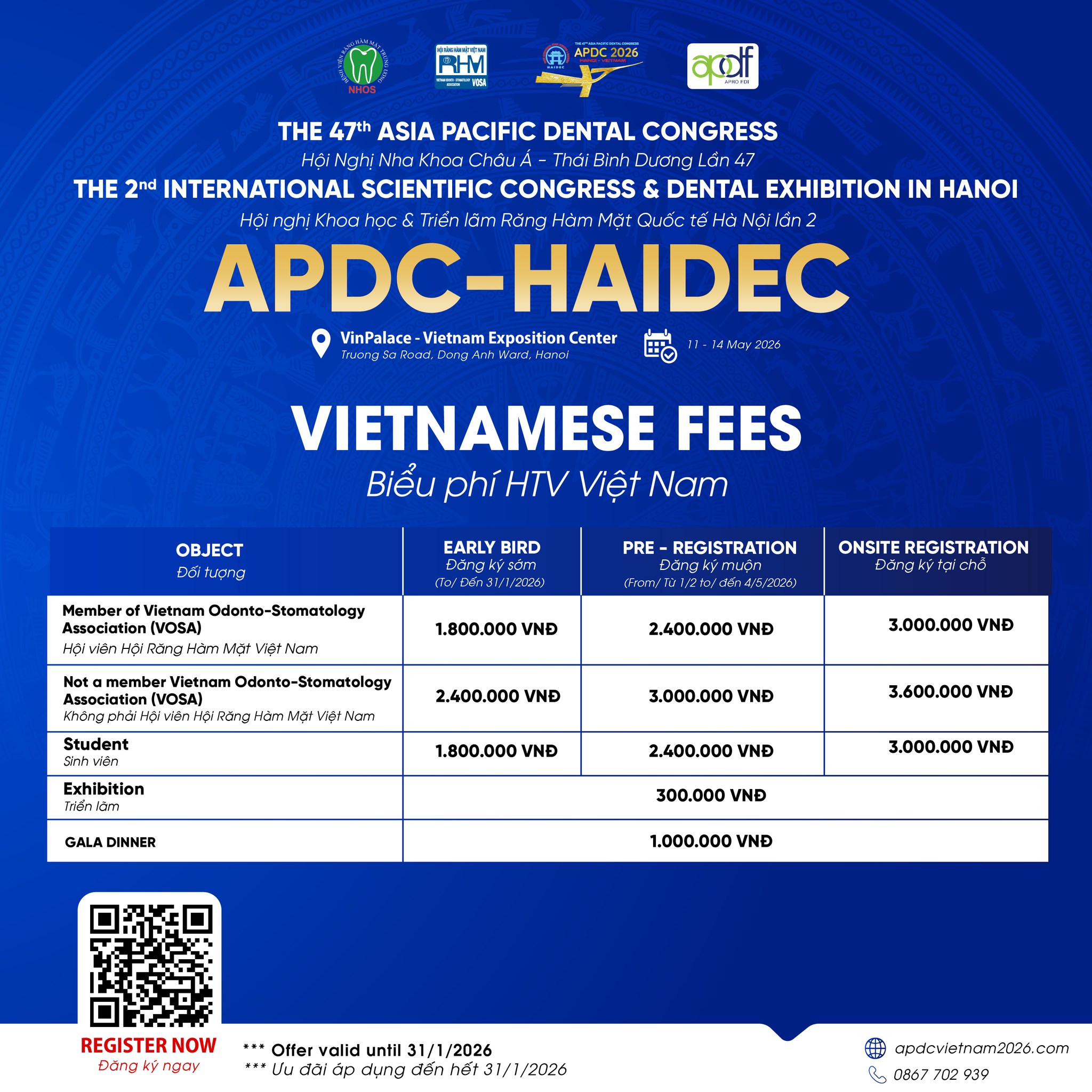 The Organizing Committee of the 47th Asia Pacific Dental Congress (APDC 2026), combined with the 2nd Hanoi International Dental Exhibition & Conference (HAIDEC 2026), is pleased to announce that the official registration fee schedule has been updated at: https://apdcvietnam2026.com/bieu-phi/