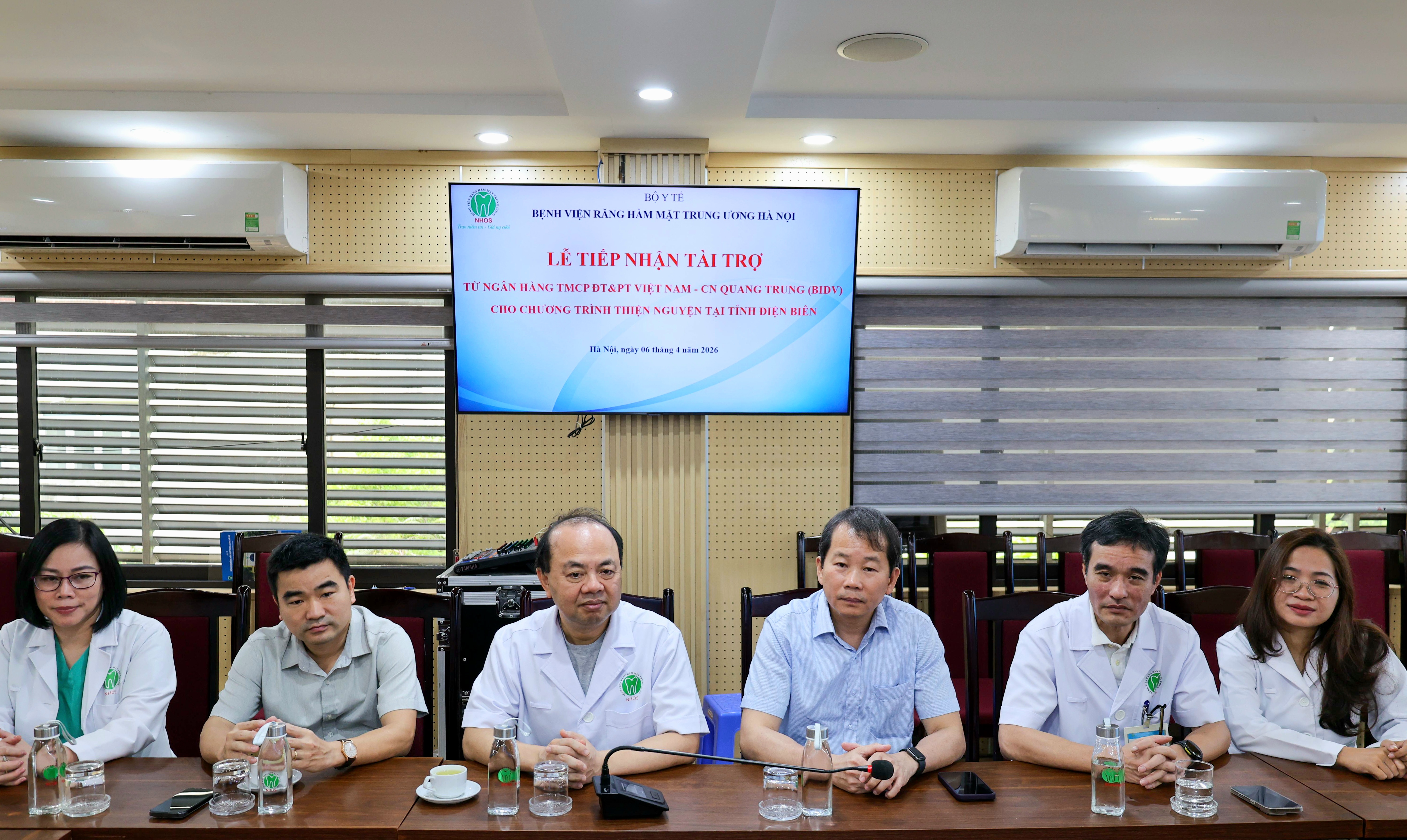 Sáng ngày 06/04/2026, Bệnh viện Răng Hàm Mặt Trung ương Hà Nội (Bệnh viện) đã long trọng tổ chức Lễ tiếp nhận tài trợ từ Ngân hàng TMCP Đầu tư và Phát triển Việt Nam – Chi nhánh Quang Trung (BIDV Quang Trung) nhằm triển khai chương trình thiện nguyện ý nghĩa tại tỉnh Điện Biên. Đây là hoạt động thiết thực, thể hiện tinh thần trách nhiệm xã hội, sự chung tay vì cộng đồng, hướng tới hỗ trợ chăm sóc sức khỏe và nâng cao chất lượng cuộc sống cho người dân vùng khó khăn.