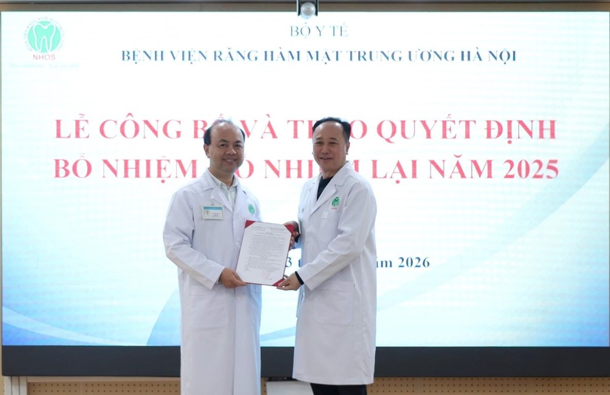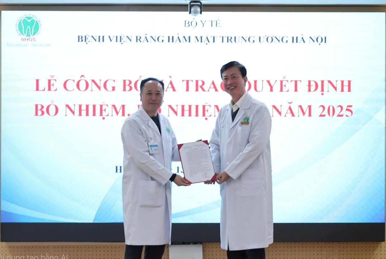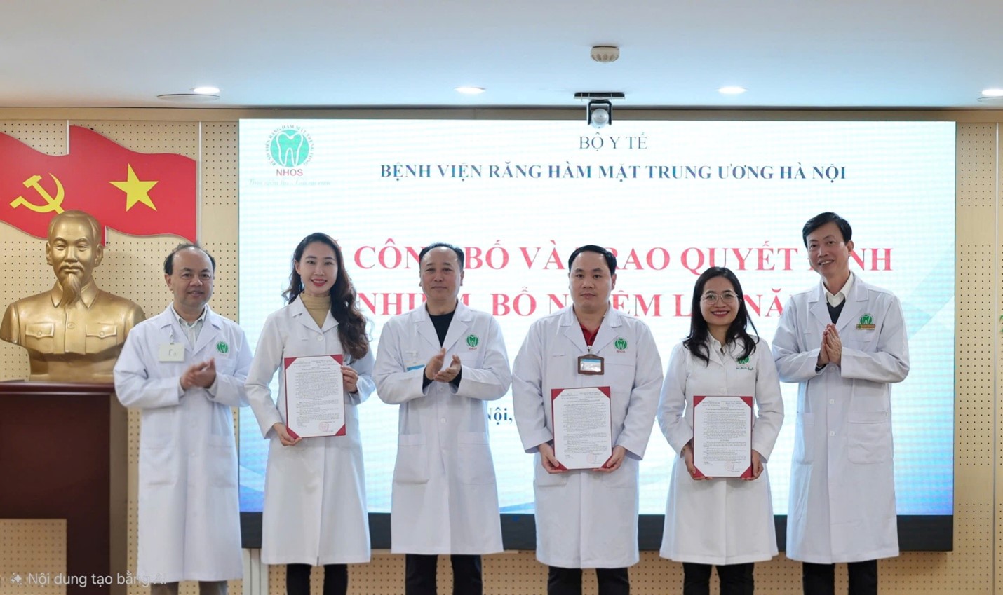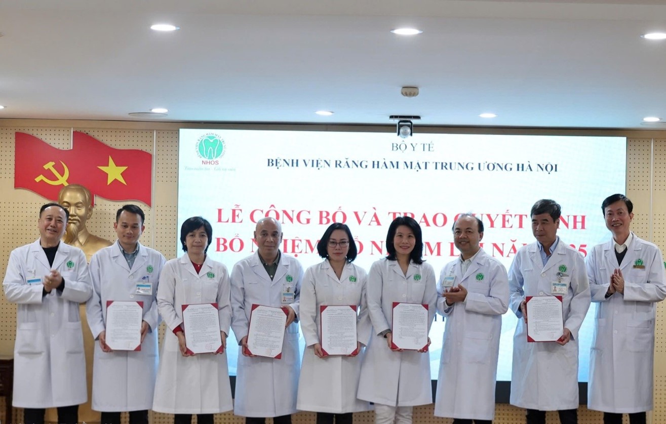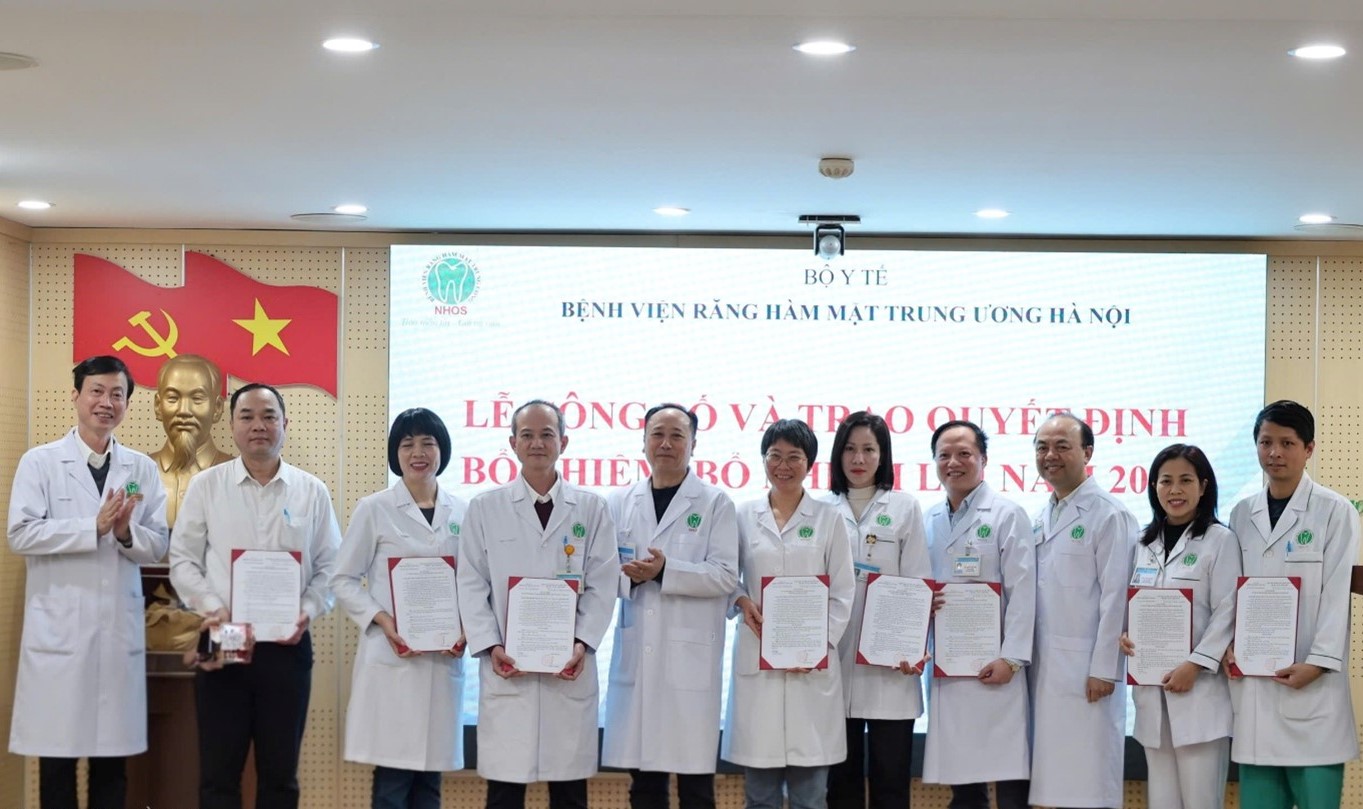 Thực hiện công tác kiện toàn tổ chức bộ máy, Bệnh viện Răng Hàm Mặt Trung ương Hà Nội (Bệnh viện ) long trọng tổ chức Lễ công bố và trao quyết định của Giám đốc Bệnh viện về việc bổ nhiệm, bổ nhiệm lại lãnh đạo một số khoa, phòng. Buổi lễ là hoạt động có ý nghĩa quan trọng thể hiện sự quan tâm của Đảng ủy, Ban Giám đốc Bệnh viện trong công tác cán bộ, góp phần nâng cao hiệu quả quản lý, điều hành và chất lượng khám chữa bệnh.