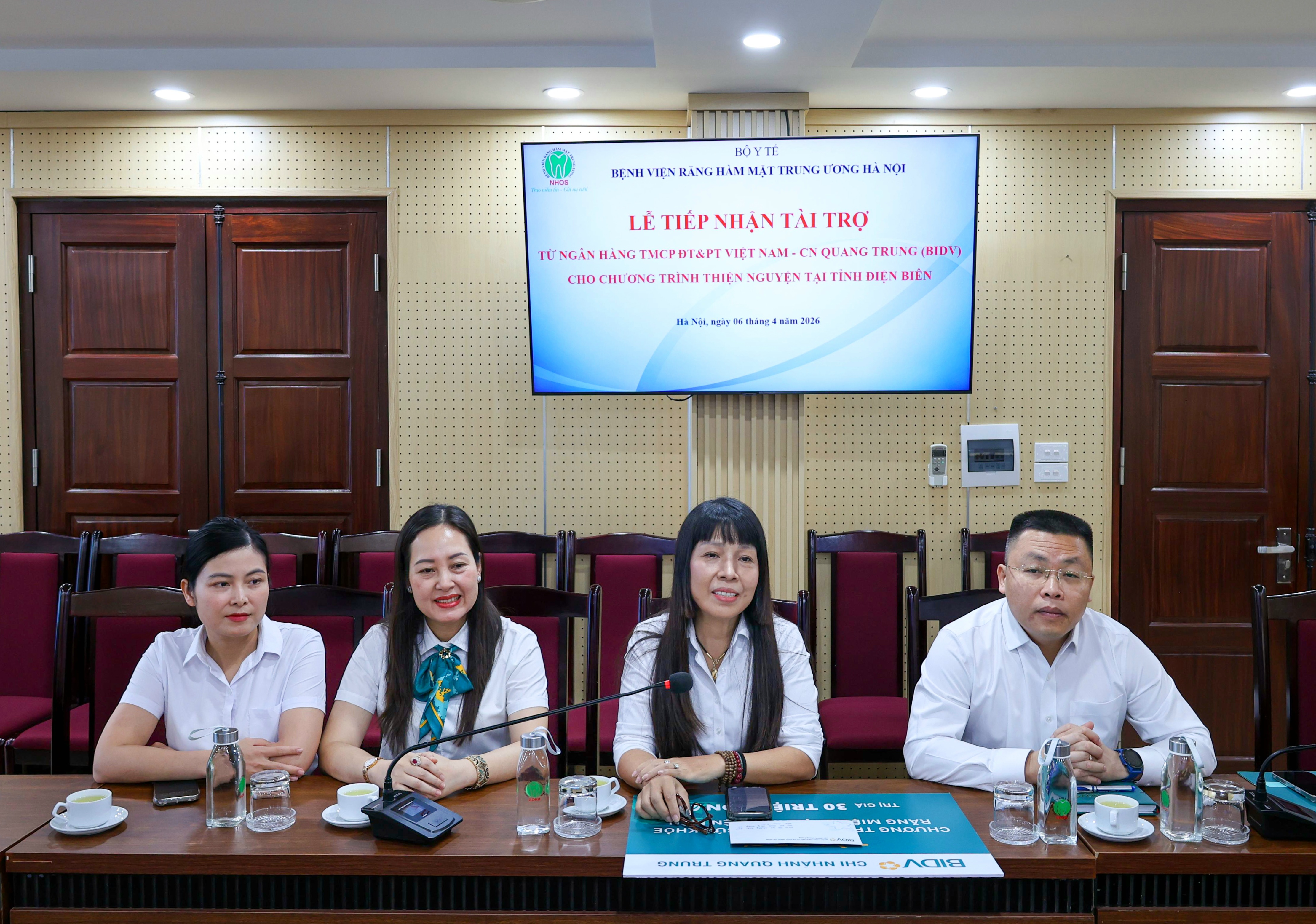 Sáng ngày 06/04/2026, Bệnh viện Răng Hàm Mặt Trung ương Hà Nội (Bệnh viện) đã long trọng tổ chức Lễ tiếp nhận tài trợ từ Ngân hàng TMCP Đầu tư và Phát triển Việt Nam – Chi nhánh Quang Trung (BIDV Quang Trung) nhằm triển khai chương trình thiện nguyện ý nghĩa tại tỉnh Điện Biên. Đây là hoạt động thiết thực, thể hiện tinh thần trách nhiệm xã hội, sự chung tay vì cộng đồng, hướng tới hỗ trợ chăm sóc sức khỏe và nâng cao chất lượng cuộc sống cho người dân vùng khó khăn.