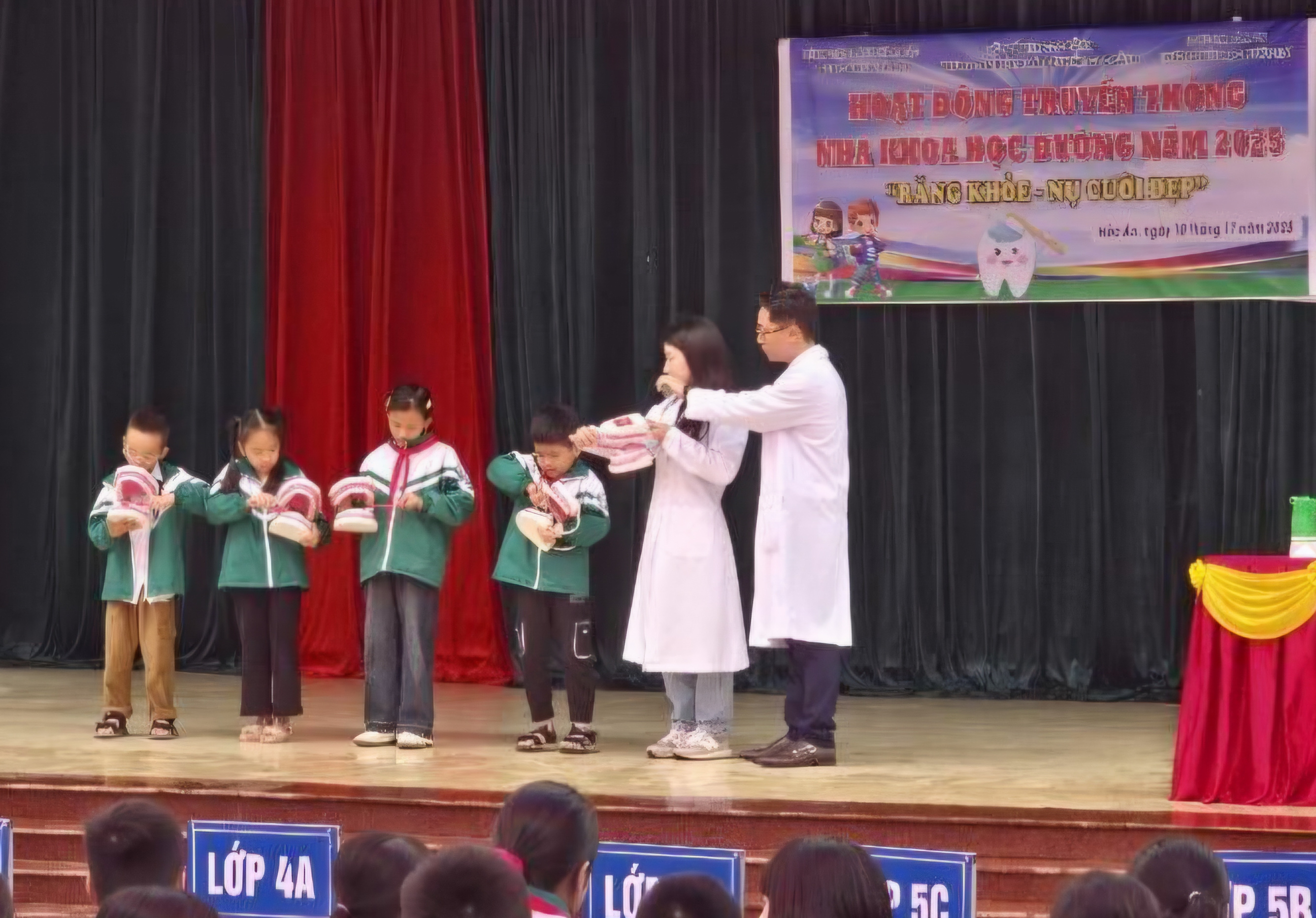 Tại buổi truyền thông, đoàn công tác của Bệnh viện đã chia sẻ kiến thức thiết thực về chăm sóc răng miệng, tập trung vào các phương pháp dự phòng hiệu quả. Các em học sinh được tham gia vào trò chơi để ghi nhớ thông tin về các thực phẩm tốt và không tốt cho răng, thực hành chải răng đúng cách với mô hình 3D, đồng thời tiếp nhận thông điệp 2-2-2-2 (chải răng ít nhất 2 lần/ngày, thời gian chải răng ít nhất 2 phút/lần, hạn chế ăn uống sau chải răng ít nhất 2 giờ, khám định kỳ răng miệng ít nhất 2 lần/năm).